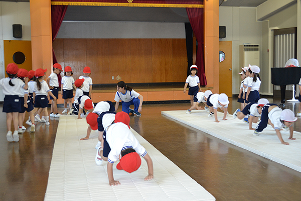 もみじ幼稚園では、お子さんの成長にともない、体力をつけていかなければと考えまして、昭和53年から保育時間内に「体力づくり教室」を行っています。