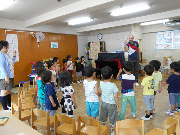 もみじ幼稚園では、小学校でも英語の授業が始まることを受けて、平成13年から保育時間内に『英語の先生と遊ぶ日』を行っています。